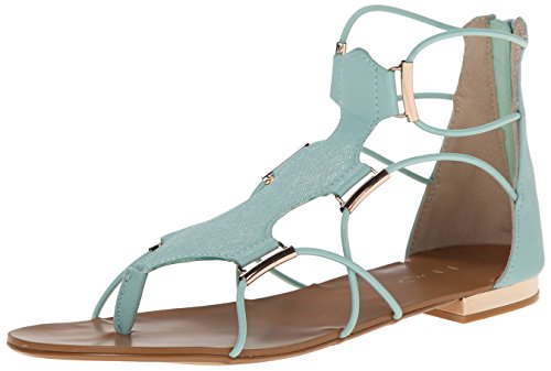 - Flat sandal with elasticized straps featuring zipper entry at counter and metallic piecing at vamp and heel