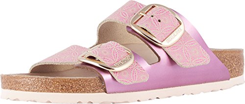 PRODUCT DESCRIPTION The Arizona Big Buckle has a bold and beautiful appearance. For a fresh seasonal take it now comes with two materials: a printed leather ceramic pattern and metallic leather. The result is a vibrant, elegant sandal featuring our half-exquisite footbed. Anatomically formed cork and latex footbed Upper: Nubuck leather / leather with metallic layer of film Footbed lining: half-exquisite Sole: EVA Made in Germany
