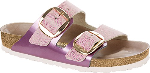 PRODUCT DESCRIPTION The Arizona Big Buckle has a bold and beautiful appearance. For a fresh seasonal take it now comes with two materials: a printed leather ceramic pattern and metallic leather. The result is a vibrant, elegant sandal featuring our half-exquisite footbed. Anatomically formed cork and latex footbed Upper: Nubuck leather / leather with metallic layer of film Footbed lining: half-exquisite Sole: EVA Made in Germany