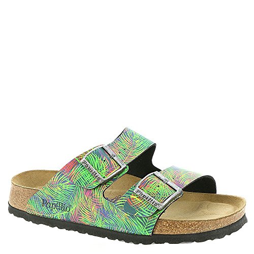 Birkenstock® Size Chart Please be advised that the Birkenstock® Narrow width accommodates both traditional narrow and medium widths. Click here for more information about Birkenstock's widths. This Arizona adds some fun and fashionable flair to a classic! This style is part of the Papillio Collection by Birkenstock®. Birko-Flor™ upper made of acrylic and polyamide felt fibers, this material is a soft fabric with a smooth leather-like finish. The leather-lined, contoured footbed will mold to the shape of your foot creating a custom footbed that supports and cradles your each and every step. Raised toe bar is designed to encourage the natural gripping motion of your feet, exercising your legs and aiding circulation. The soft footbed features a foam layer inserted between the cork layer and suede liner of the original Birkenstock footbed. Microscopic air bubbles cushion your feet while providing moderate arch support. Neutral heel profile and deep heel cup keeps the natural padding of your foot where it belongs, under the heel, distributing your body weight more evenly. Flexible EVA outsole offers lightweight, shock absorbing support with lasting durability. Dual layer Jute: top wicks away moisture while the bottom adds strength and makes resoling easy. You will enjoy your Birkenstock® sandals for years because they can be repaired, resoled or even completely renewed. Heat Warning - Cork footbeds or EVA soles can be damaged by exposure to concentrated heat. Do not leave your footwear in direct sunlight or in closed cars on warm days. If your footwear becomes wet, allow it to air dry slowly, away from direct heat. Made in Germany. Measurements: Heel Height: 1 1⁄2 in Weight: 10 oz Product measurements were taken using size 38 (US Women's 7-7.5), width Narrow. Please note that measurements may vary by size.
