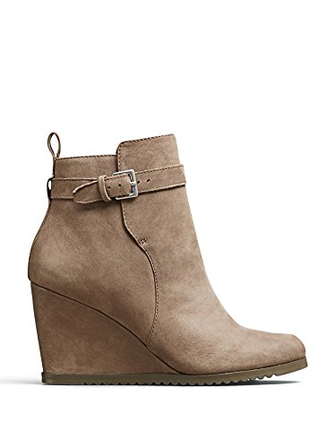 - Covered-wedge boot featuring adjustable ankle strap with buckle and rear pull-on loop