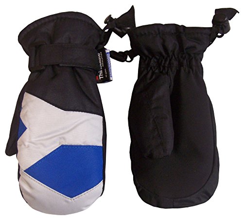 N'Ice Caps TM kids Thinsulate and waterproof colorblocked ski mitten. Color options: black/silver grey/royal, black/turq/fuchsia. Sizes: one size fits 2-4yrs (3.5" across palm, 5.5" from elastic to end of mitten fingers.) One size fits 4-7yrs (4" across palm, 6" from elastic to end of mitten fingers.) One size fits 8-12yrs (4.25" across palm, 6.5" from elastic to end of mitten fingers.) Tested and approved as per CPSIA standards.