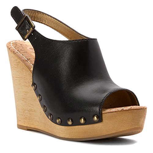 Leather Sam Edelman wedges in an open toe profile. Antiqued studs detail the wooden base. Buckle closure. Crepe sole.