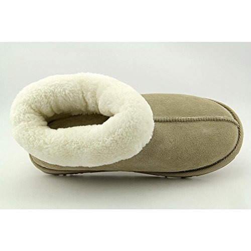 - Ankle-high slipper booties with faux-fur cuff and center-split seam at vamp