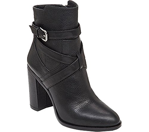 - Ankle-high boot featuring covered block heel and crossing strap overlays with polished buckle